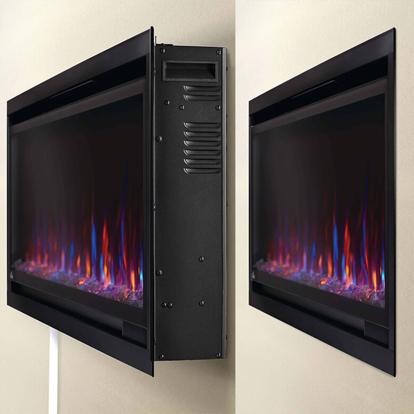 Since the Napoleon Premium Fire electric fireplaces of the ALLURE™ PHANTOM series have a flat form factor with a depth of just 13.6 centimetres, they barely protrude into the room. They can be mounted on or flush with the wall.