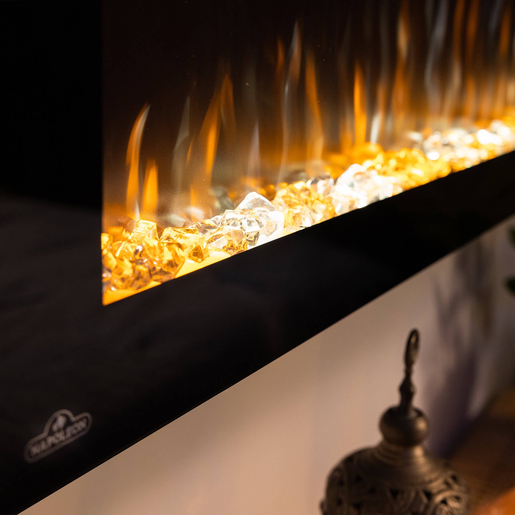 Du bekommst auf Knopfdruck dein persönliches Wohlfühlgefühl bei einer Auswahl aus drei Flammenfarben: orange, weiß und Multi-Colour. Und für ein noch intensiveres Flammenerlebnis bei diesen strombetriebenen Kaminen von Napoleon sorgen die Kristallglut-Elemente als Bodenbedeckung und hochintensive LEDs mit langer Lebensdauer und einem geringen Stromverbrauch.