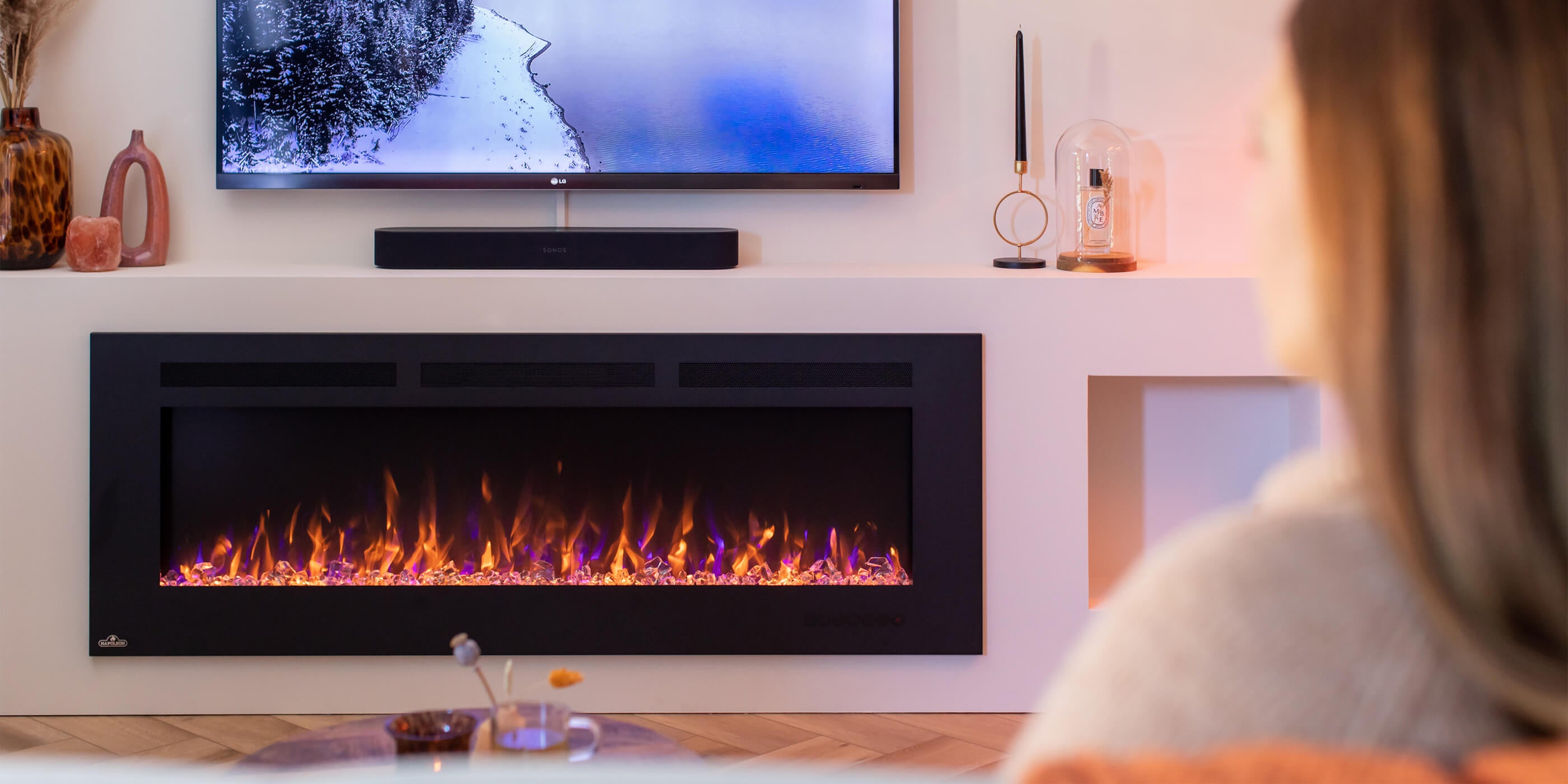 The Napoleon Premium Fire electric fireplaces of the ALLURE™ PHANTOM series are extra powerful when it comes to both flame image and heat generation. The matt black metal front with metal mesh of these electric fireplaces ensures a reflection-free view of the flames and the play of colours of the crystal embers in the floor covering. Particularly in rooms with difficult lighting conditions, this highlight of the electric fireplace translates to pure enjoyment for yourself.